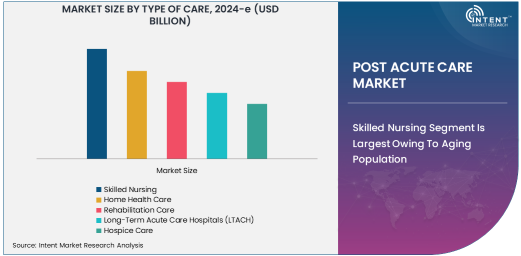 Among the various types of care, skilled nursing remains the largest segment in the post-acute care market. Skilled nursing services involve comprehensive medical care for patients who require ongoing monitoring and assistance after they are discharged from the hospital. This service is particularly important for elderly patients, who often face complex health issues requiring continuous attention and care. Skilled nursing facilities (SNFs) offer services such as wound care, physical therapy, medication management, and more. The aging global population, especially in developed regions, has driven the demand for skilled nursing care as a critical part of post-acute recovery.